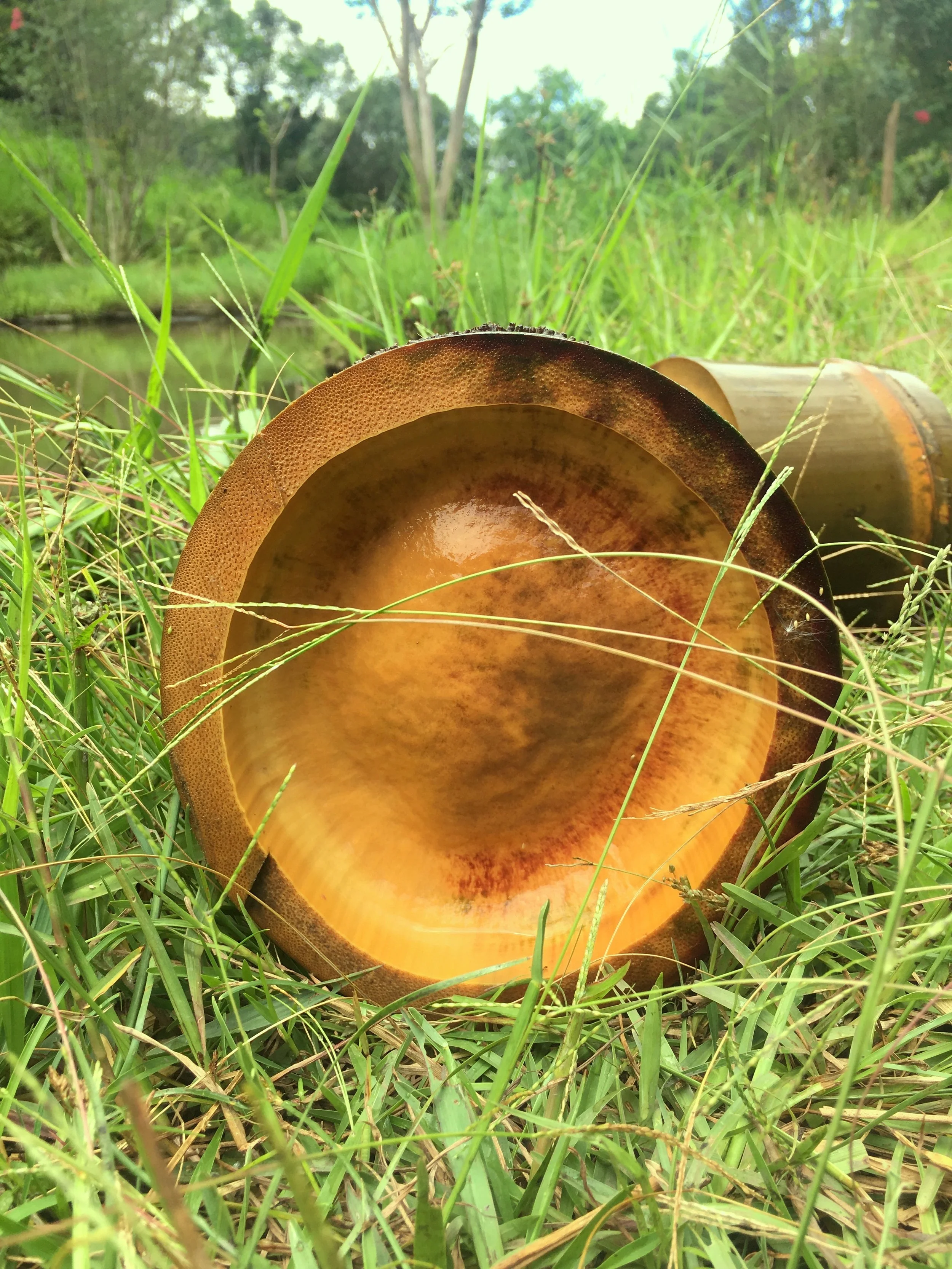 My crafted objects are nourished with multiple coats of 100% pure Tung oil, allowing ample time—at least 30 days, often longer—for the oil to fully cure. As it seeps into the bamboo, it enriches the fibers, deepening its natural warmth with a golden hue while enhancing its strength and durability.